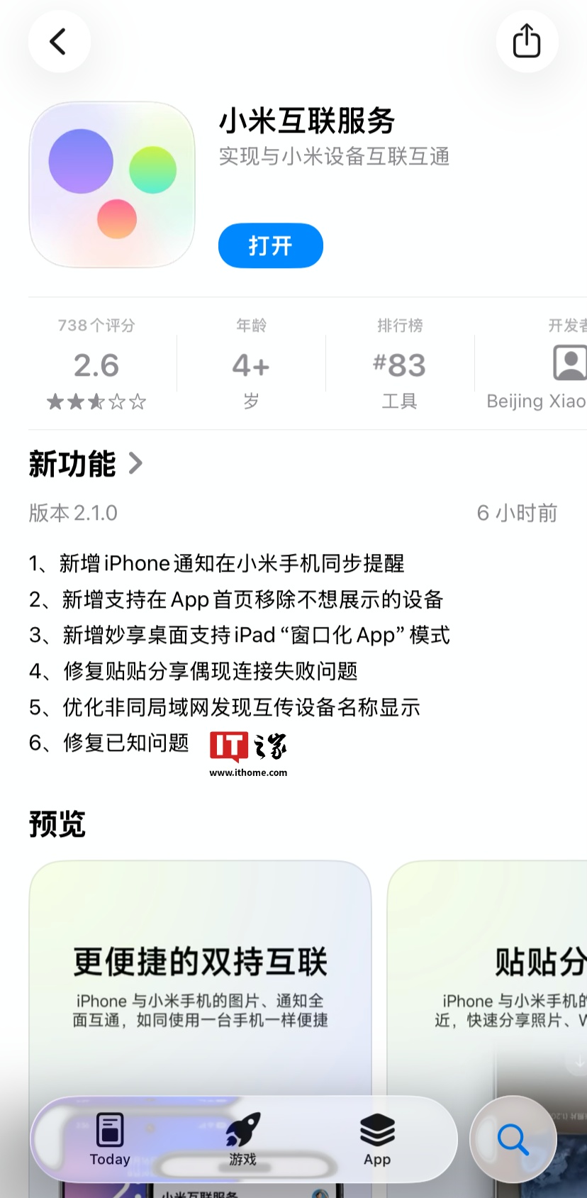 IT之家注意到,小米互联服务今日再次迎来升级,新增 iPhone 通知在小米手机同步提醒、妙享桌面支持 iPad“窗口化 App”模式等功能。具体如下: