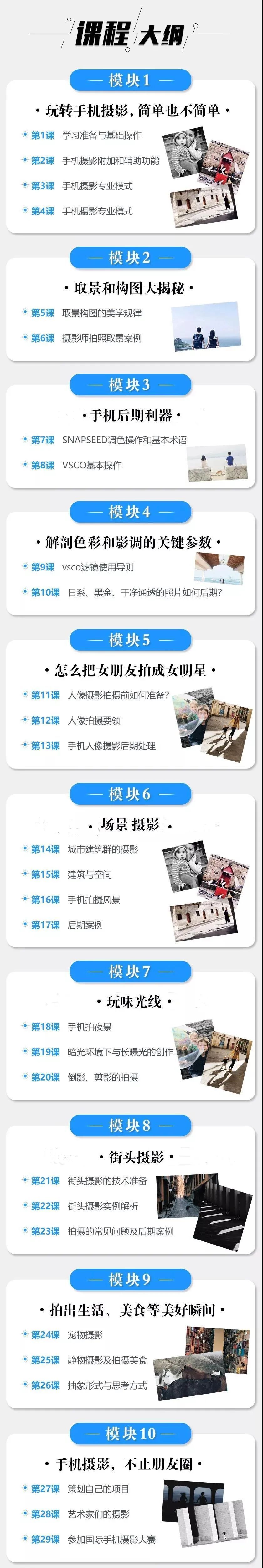 课程既有手机摄影的基础知识,也有关于用光、构图、拍摄、后期方面的核心技巧。
