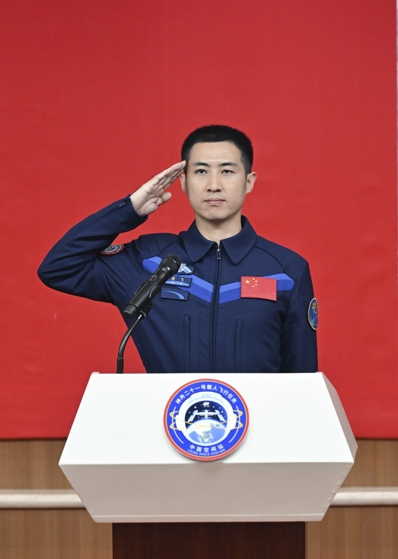 10月30日,神舟二十一号载人飞行任务航天员张陆、武飞、张洪章在酒泉卫星发射中心问天阁与媒体记者集体见面。这是航天员张陆与媒体记者见面。\n 新华社记者 李志鹏 摄
